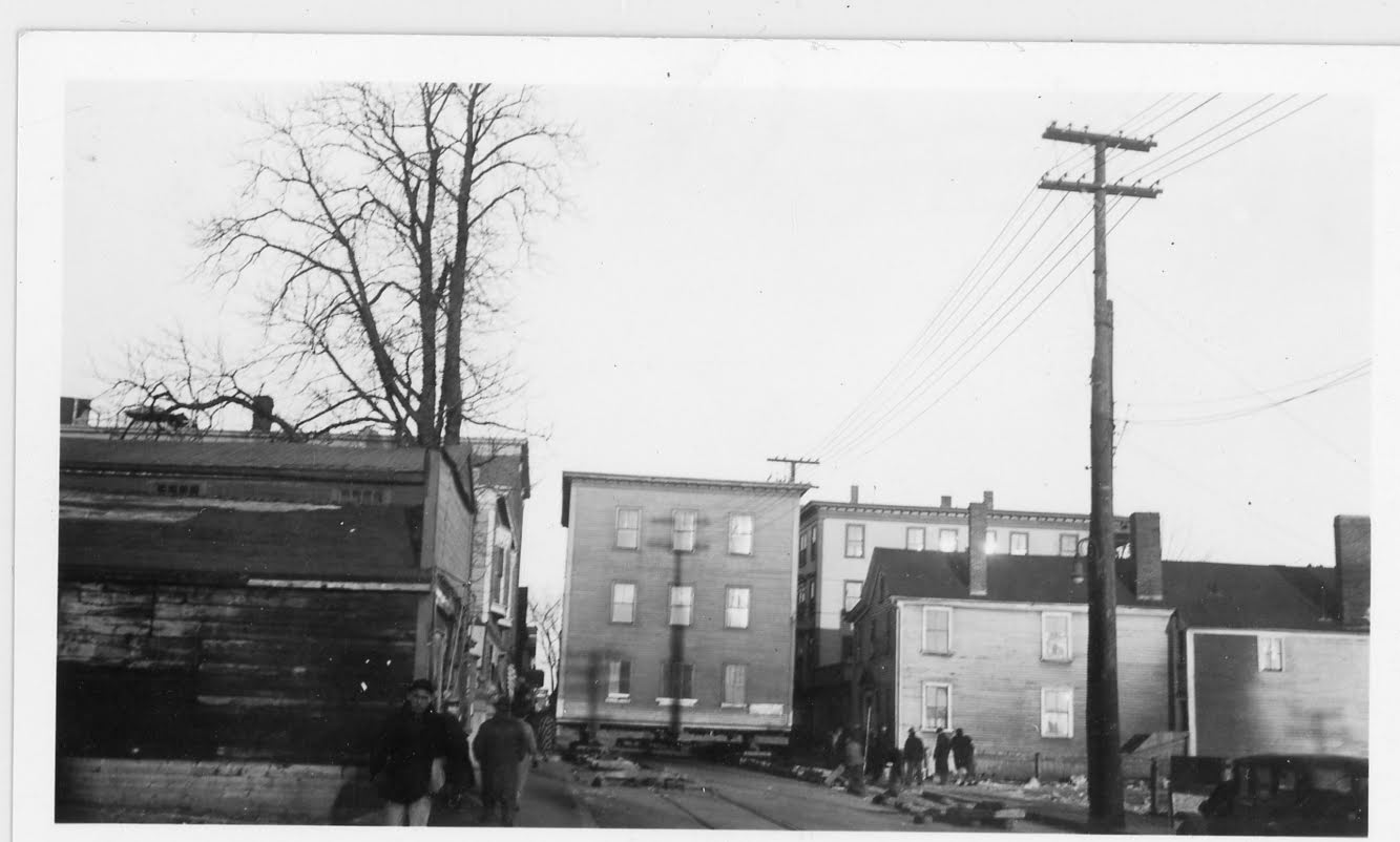 The discovery of the still extant home on Phelps Street led Jen Ratliff to the search for additional buildings that may still survive today. Another photo was found in the photograph collection, this time showing a three-story building on jacks in the middle of Derby Street.