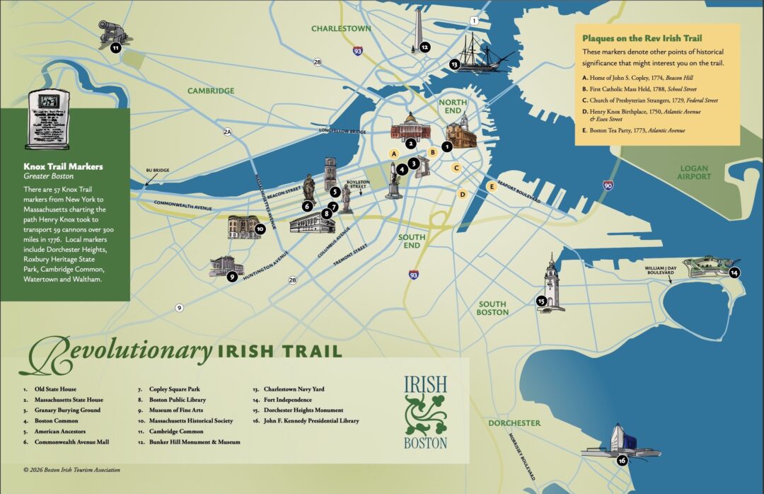 Formed in 2000, Boston Irish Tourism Association promotes Irish cultural activities in Massachusetts and New England year round, as well as travel to Ireland. BITA works with more than 60 local organizations to present regional cultural activities, from parades and festivals to performing arts and literary activities. BITA also oversees Boston’s Irish Heritage Trail, a trail formed in 1994 to explore 300 years of Boston Irish history. In 2026 the trail is expanding to include new downtown and neighborhood sites and will eventually encompass the entire Commonwealth. In March 2026 BITA released a new Revolutionary Irish Trail, a selection of Boston and Cambridge landmarks celebrating the Irish and Scots-Irish role in the American Revolution. Plans are underway to add more sites in MA, NH, ME and beyond.